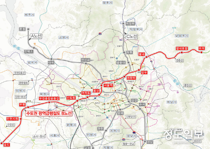 GTX-B노선은 인천송도~부천종합운동장~여의도~용산~서울역~청량리를 지나 남양주 마석까지 수도권 동·서를 횡으로 연결하는 총 길이 80.1㎞ 노선이다.