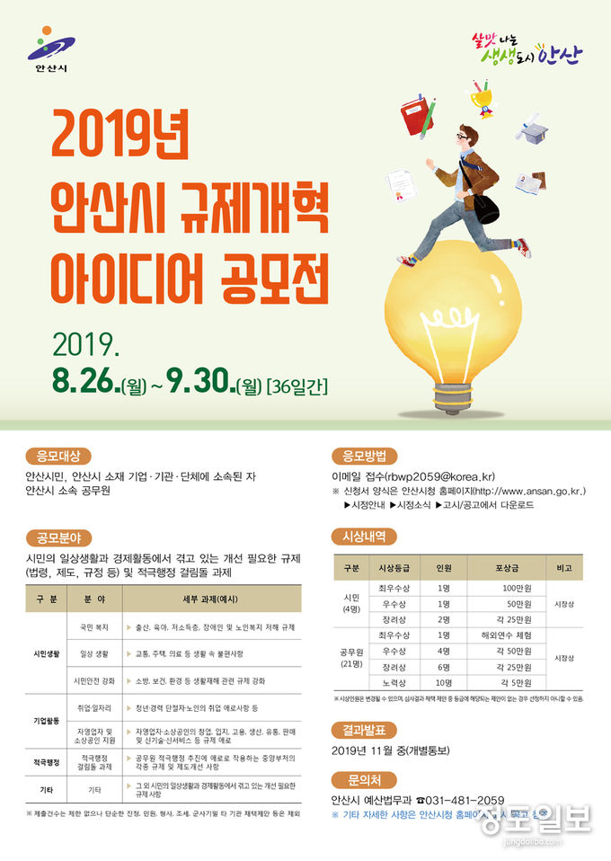 (정도일보) 안산시는 시민의 일상생활과 경제활동에서 겪는 불합리한 규제 및 적극행정 걸림돌 과제 등을 발굴·개선하기 위해 ‘2019년 안산시 규제개혁 공모전’을 개최한다고 27일 밝혔다.
