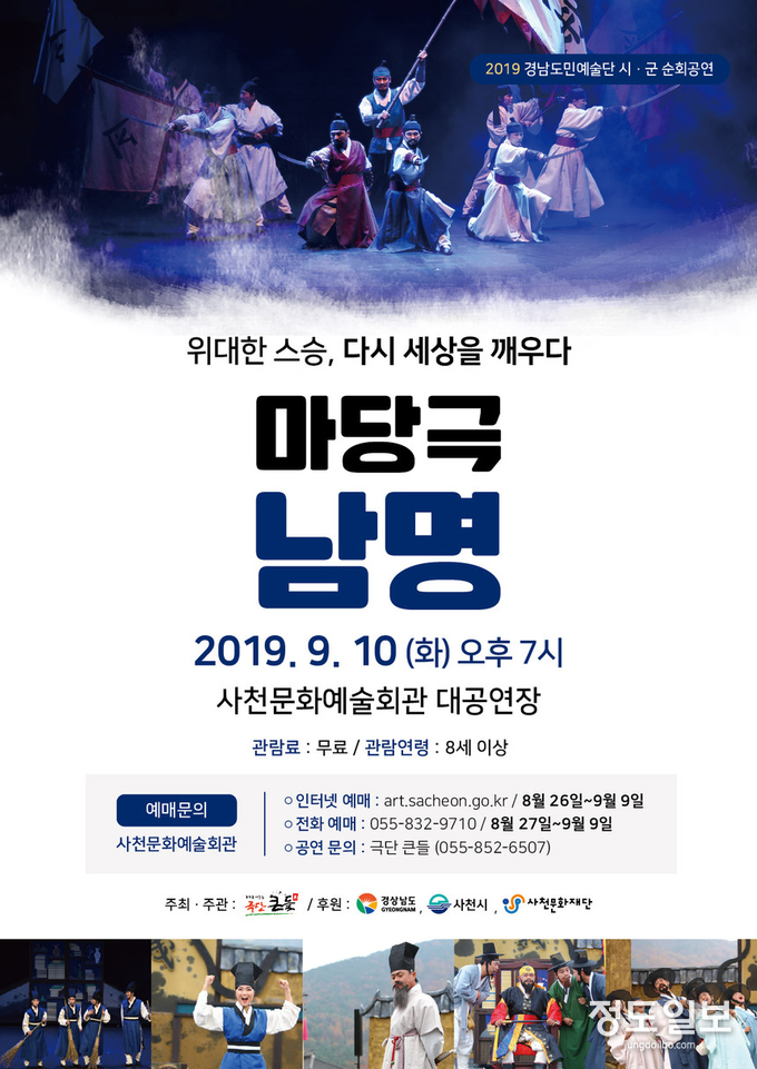 (정도일보) 사천시문화예술회관에서 다가오는 9월 10일 저녁 7시 큰들문화예술센터에서 주최·주관하고 경상남도, 사천시, 사천문화재단에서 후원하는 경남도민예술단 순회공연 마당극 ‘남명’ 공연이 개최된다.