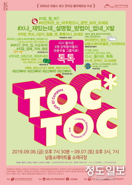 (정도일보) 남녀노소가 공감할 수 있는 웃음과 따뜻한 감동의 코미디 연극 ‘톡톡’이 오는 9월 6일 오후 7시 반, 9월 7일 오후 3시와 7시에 남동소래아트홀에서 관객들과 만난다.