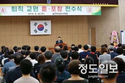 (정도일보) 전라남도교육청이 28일 오전 청사 2층 대회의실에서 2019년 8월말 퇴직교원 훈·포장 전수식을 개최했다.