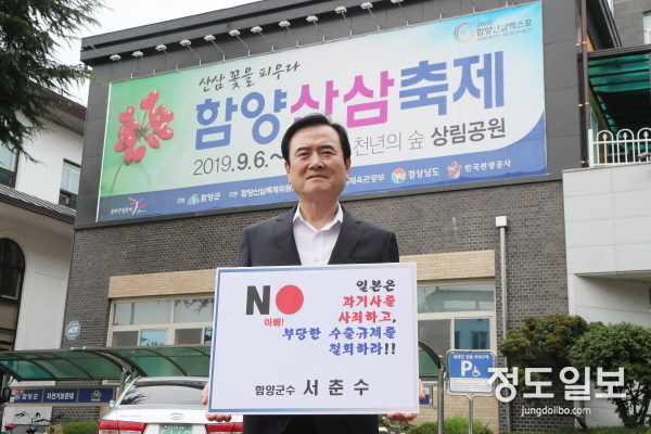 서춘수 군수는 이날 ‘노 아베 일본은 과거사를 사죄하고, 부당한 수출규제를 철회하라’는 피켓을 들고 아베 정부의 위선적인 행태를 비판했다.