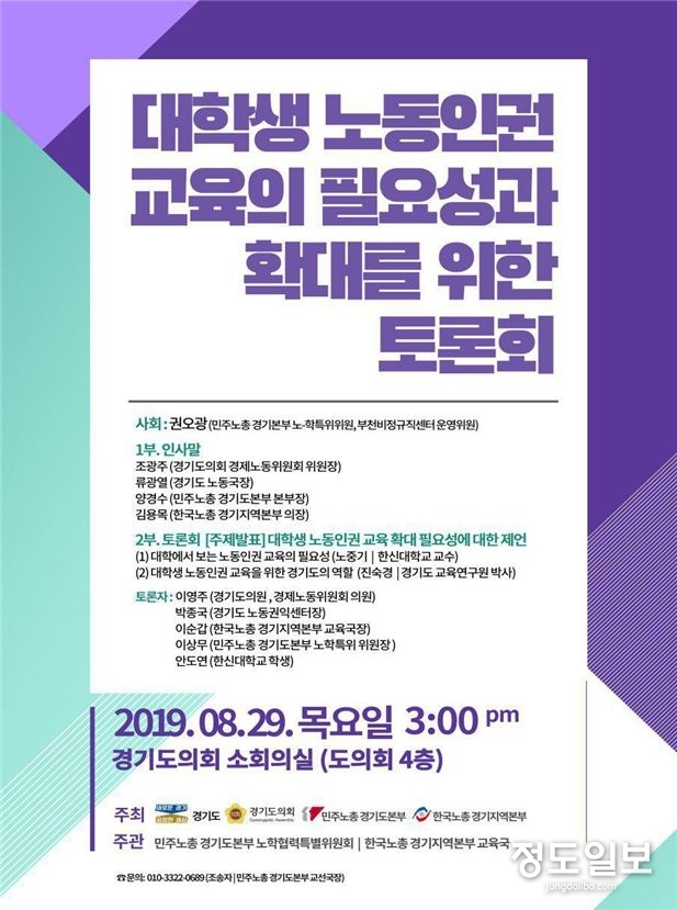 (정도일보) 경기도가 경기도의회, 민주노총 경기도본부, 한국노총 경기지역본부와 함께 29일 오후 3시 경기도의회 소회의실에서 ‘경기도 대학생 노동인권 교육의 필요성과 확대를 위한 토론회’를 개최한다.