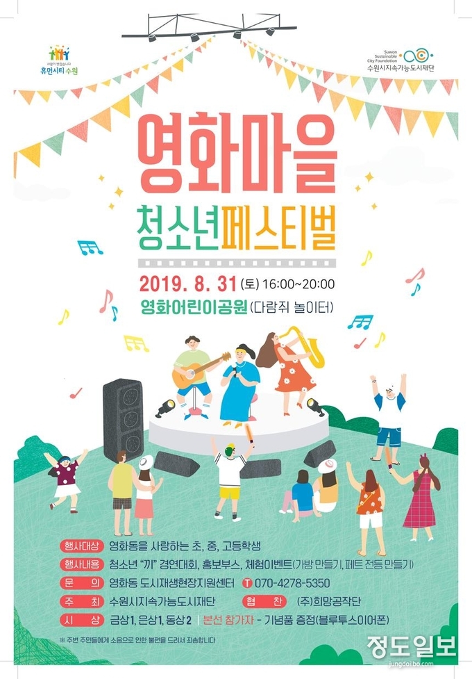 (정도일보) 수원 영화동을 사랑하는 시민이 함께 어우러지는 ‘2019 영화마을 청소년 페스티벌’이 오는 31일 오후 4시 장안구 영화어린이공원 다람쥐놀이터에서 열린다.