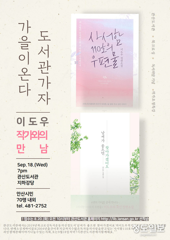 (정도일보) 안산시 관산도서관에서는 9월 독서의 달을 기념해 ‘사서함 110호의 우편물’과 ‘날씨가 좋으면 찾아가겠어요’의 저자인 이도우 작가를 초청해 내달 18일 저녁 7시 관산도서관 강당에서 특강을 진행한다고 30일 밝혔다.