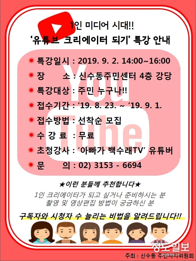 (정도일보) 마포구는 ‘유튜브 크리에이터 되기’ 무료 특강을 오는 9월 2일 오후 2시부터 신수동주민센터에서 진행한다고 밝혔다.