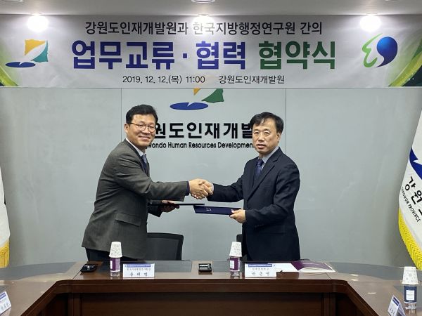 (정도일보) 강원도인재개발원과 한국지방행정연구원은 12일 인재개발원에서 지방자치 발전을 선도하는 우수한 지역인재 양성에 상호 협력하는 내용을 담은 업무협약을 체결했다.