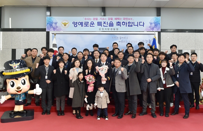 [강원=안준희 기자] 강원지방경찰청(청장 김재규)에서는 지난 13일 청사 1층 포토존에서 각 과, 계장 및 직원들이 참석한 가운데 강원지방경찰청 사이버수사대 김두호 경위의 특별승진 임용식을 진행했다.