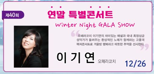 이기연 오페라연구소의 대표이자 오페라코치인 이기연 강사가 국내 최정상급 성악가와 함께 연말 특별콘서트를 선사한다.