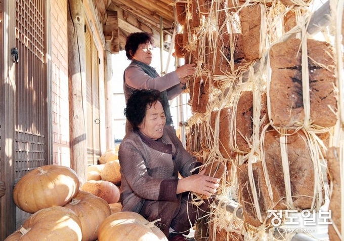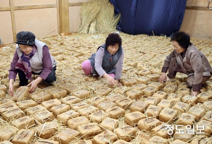 [전남=윤진성 기자]영하로 떨어진 아침 기온과 달리 포근한 날씨를 보인 성탄절인 지난 25일 전남 강진군 군동면 전통된장마을에서는 만들어진 메주가 발효실에서 숙성이 잘 되도록 뒤집어주고 건조대에 걸어둔 메주가 제대로 말라가는지 살피는 동네 할머니들의 정성이 이어지고 있다.