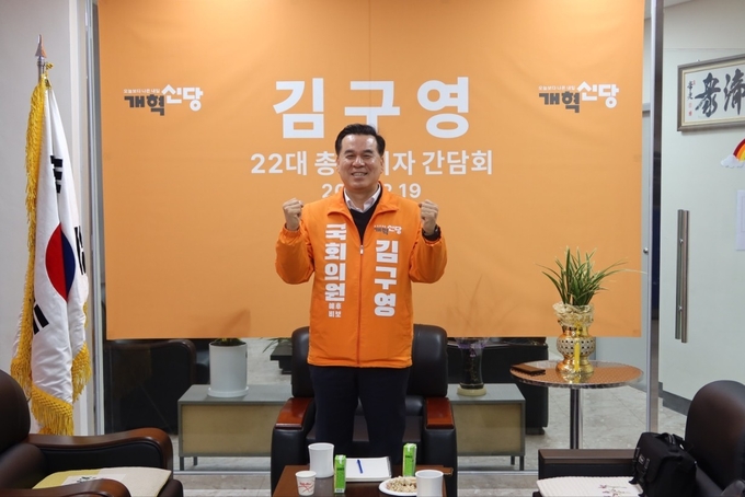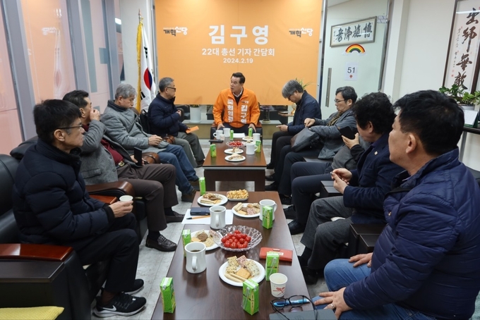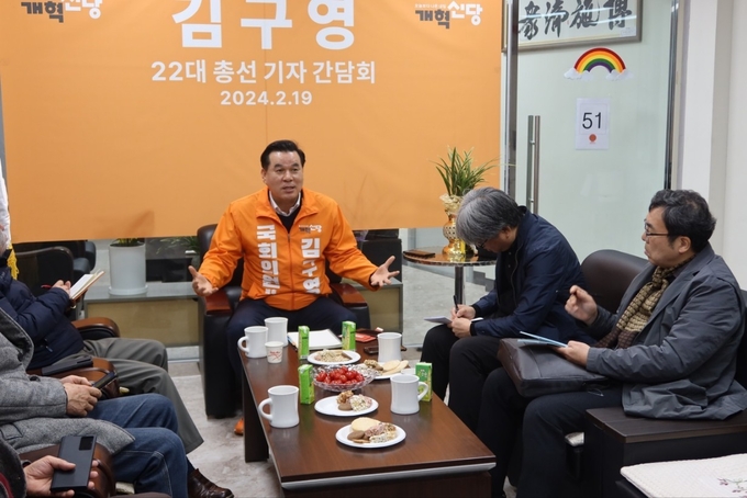 지난 19일 김구영 개혁신당 예비후보가 언론인 간담회를 개최하고 공약 설명, 현안 질의 응답 등을 진행하고 있다.