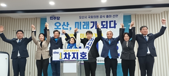 차지호 민주당 오산시 국회의원 후보가 지난 18일 출마 선언을 하는 가운데, 오산시 민주당 소속 시·도의원과 곽상욱 전 시장도 동석해 원-팀임을 강조하고 있다. .