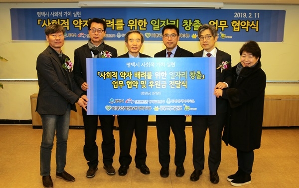 [평택=안근학 기자] 평택시(시장 정장선)와 (주)한국서부발전(사장 김병숙), (재)평택복지재단(이사장 김기성), 동방사회복지회(대표 김현기), (사)한국장애인부모회평택시지부(지회장 최중경), 평택지역자활센터(센터장 김양수)가 11일 동방평택복지타운에서 ‘평택시 사회적 약자 배려를 위한 일자리창출’ 확대를 위해 기부금 전달 및 업무 협약을 체결했다.