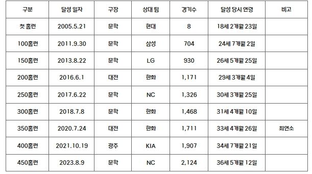 한 팀에서만 활약하며 매년 꾸준함으로 대기록 달성을 앞둔 최정은 지금과 같은 활약을 이어간다면 KBO리그 최초 개인 통산 500홈런 달성도 시간 문제일 것으로 전망된다.