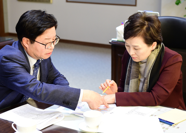 ▲ 14일 염태영 시장과 김현미 장관이 만나 신분당선 연장선 조속 착공을 위한 이야기를 나누고 있다. [수원=김현섭 기자] 염태영 수원시장이 14일 서울로 내려가 김현미 국토교통부 장관을 만난 자리에서 '신분당선 연장선 조기착공 추진' 등 수원시 주요현안을 설명하며 “국토교통부가 현안 해결에 적극적으로 협조해 달라”고 건의했다.
