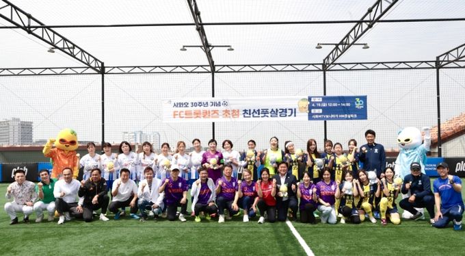 (정도일보) 시흥시가 시화호 30주년 기념행사의 일환으로 지역사회에 활력을 높이고자 19일 시화MTV 보니타가 옥상 풋살구장에서 FC트롯퀸즈를 초청한 친선 축구 경기를 진행했다.