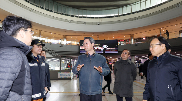 [경기=김현섭 기자] 14일 오전 수원역·광교중앙역 환승센터 현장점검을 위해 김희겸 행정1부지사와 백운석 수원시 제2부시장, 이부영 수원도시공사 사장, 남동경 경기도청 광역도시철도과장등이 수원역·광교중앙역 환승센터를 방문했다.