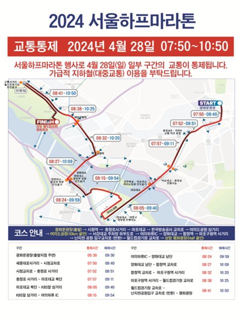 28일 오전 5시 30분부터 11시까지 광화문광장~마포대교~월드컵공원 평화광장 등 주요 마라톤 코스 구간에 대해 단계적인 교통통제가 이뤄진다. 교통통제로 인한 시민 불편을 최소화하고자 시는 하프마라톤 구간별로 통제시간을 세분화, 대회 참가자가 모두 지나가면 해당 구간의 통제를 해제할 예정이다.