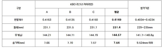 이번 검사는 KBO 리그 단일 경기사용구인 ㈜스카이라인스포츠 AAK-100의 샘플 3타를 무작위로 수거한 뒤 지난 26일(금)부터 29일(월)까지 국민체육진흥공단(KSPO) 한국스포츠개발원 스포츠용품 시험소에 의뢰해 진행했다. 검사 결과, 모든 샘플이 합격기준을 충족한 것으로 확인됐다.