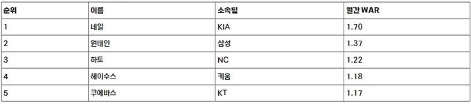 3~4월 월간 쉘힐릭스플레이어(WAR) 투수 최종 순위