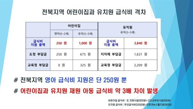 전북지역 어린이집과 유치원 급식비 격차