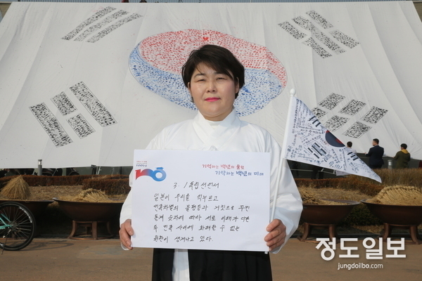 [수원=김현섭 기자] 조명자 수원시의회 의장이 '3·1 독립선언서 필사 챌린지'에 동참한 뒤 사진을 찍고 있다.