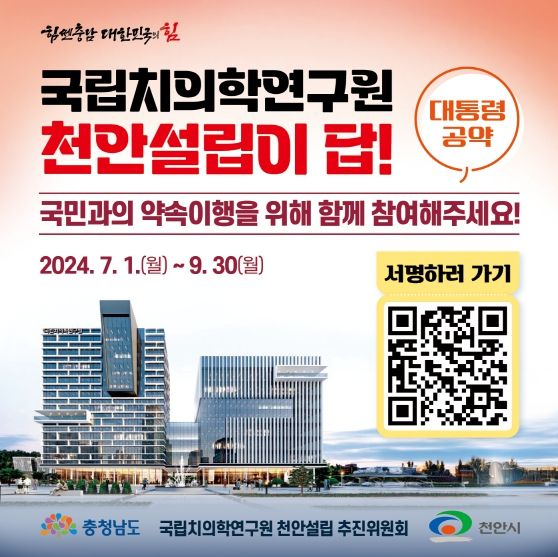 (정도일보) 충남도가 ‘국립치의학연구원 천안 설립’ 대통령 공약 이행을 촉구하기 위해 220만 도민의 의지를 모으는 서명운동에 본격 돌입했다.