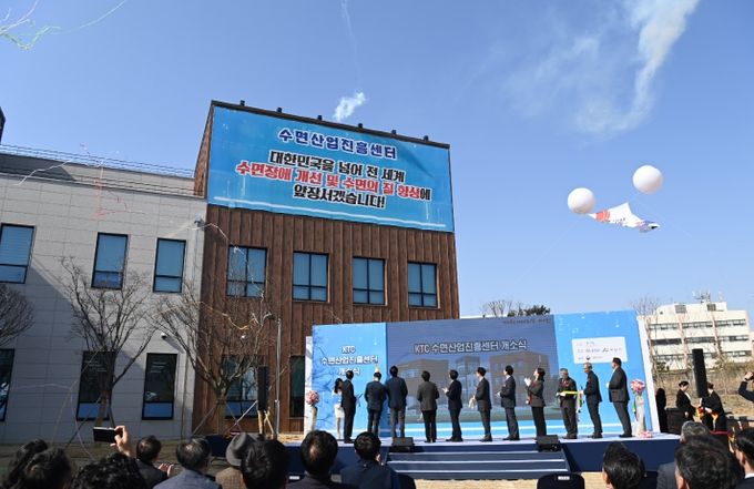 지난 3월 15일 천안아산 KTX 역세권 연구개발(R&D) 집적지구 내에 건립한 수면산업진흥센터 개소식에서 김태흠 지사(가운데)를 비롯한 참석자들이 테이프를 자르고 있다.