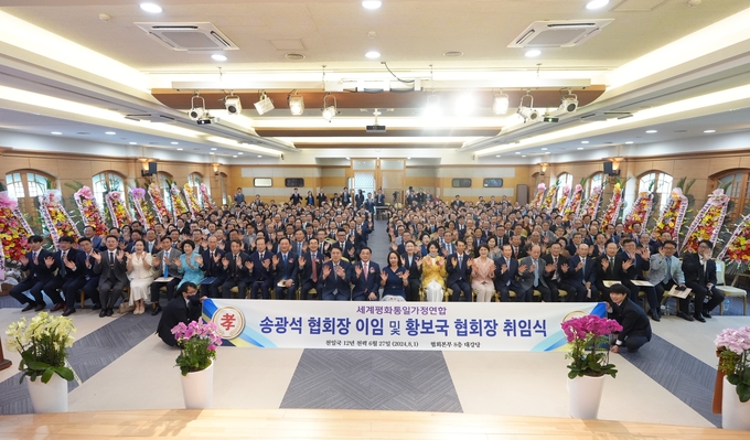 3일 협회 대외협력국 등에 따르면 이날 취임식에는 문연아 선학학원 이사장, 정원주 천무원 부원장, 송용천 세계선교본부장, 황보국 신임 한국협회장, 송광석 전임 협회장, 이기성 천심원장, 양창식 UPF세계의장과 가정연합 전국 목회자 등 300여 명이 참석했다.