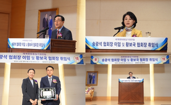 축사를하는 송용천(좌측 상단, 시계방향) 세계선교본부장. 격려사를 하는 정원주 천무원 부원장, 취임사를 하는 황보국 신임 회장, 한학자 총재를 대신해 공로패를 수여하는 문연아 선학학원 이사장/최창일 기자