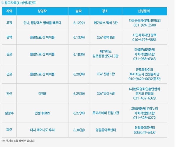 이번 6월 지역 정기상영회 상영작은 총 5작품으로 ▲‘평양 스타일’의 단편 영화 제작을 위해 분투하는 안나를 담은 <안나, 평양에서 영화를 배우다>(6월12일 고양) ▲폴란드로 보내졌다가 갑자기 송환된 1951년 한국전쟁 고아 1,500명의 이야기를 다룬 추상미 감독의 <폴란드로 간 아이들>(6월13일 평택, 18일 김포, 20일 군포) ▲생계를 위해 중국으로 탈출한 북한 여성의 사랑 이야기를 다룬 <마담B>(6월25일 안산)이 상영된다.