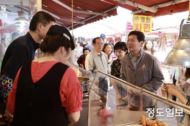 이 시장은 땅콩, 강정, 표고버섯, 참‧들기름, 깨, 떡, 과일, 전, 닭강정 등을 구입했다. 장을 보며 만나는 상인들과 시민들에게는 일일이 “추석 명절 다복하고 즐겁게 보내시길 바란다”며 인사를 하고 상인들의 애로사항도 들었다.