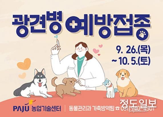 (정도일보) 파주시는 반려견을 동반한 야외활동이 많은 가을철을 맞아 9월 26일부터 10월 5일까지 생후 3개월 이상의 임신하지 않은 개를 대상으로 광견병 예방접종을 실시한다.