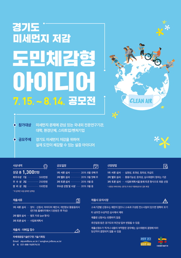 [경기=김현섭 기자] 경기도와 차세대융합기술원은 ‘경기도 미세먼지 저감 도민체감형 아이디어 공모전’에 참가할 국내외 전문연구기관 및 대학, 환경단체, 기업, 개인 등을 8월14일까지 공개모집한다.