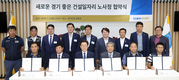 [경기=김현섭 기자] 15일 오후 경기도청 상황실에서 이재명 경기도지사와 송한준 경기도의회 의장, 김용목 한국노총 경기지역본부 의장, 변문수 민주노총 건설노조 수도권남부지역 본부장, 하용환 대한건설협회 경기도회장, 최용근 대한전문건설협회 경기도회 부회장이 ‘새로운 경기 좋은 건설일자리 노·사·정 협약’을 체결하고 관계자들과 함께 기념촬영을 하고 있다.