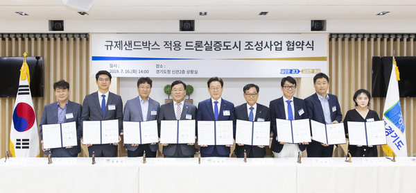 [경기=김현섭 기자] 16일 경기도청 상황실에서 이재명 경기도지사와 박덕순 화성시 부시장, 김영삼 전자부품연구원장, 장흥성 SK텔레콤(주) IOT/Data사업단장, 이병섭 ㈜억세스위 대표, 구자균 제임스컴퍼니 대표, 홍승택 두산 디지털이노베이션이머징산업 본부장, 최종필 ㈜유맥에어 대표, 노윤아 ㈜바이앤 대표가 ‘규제샌드박스 적용 드론실증도시 조성사업 협약’을 체결하고 기념촬영을 하고 있다.