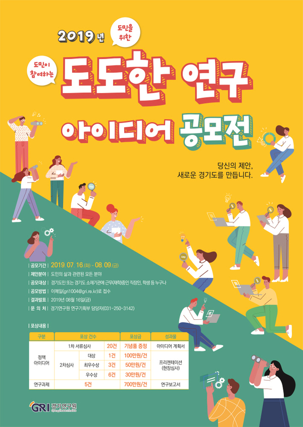 [경기=김현섭 기자] 경기연구원이 새로운 경기도를 만들기 위한 정책 아이디어 발굴과 현장 밀착형 연구 수행을 위해 ‘도도한 연구 공모전’을 개최한다고 18일 밝혔다.