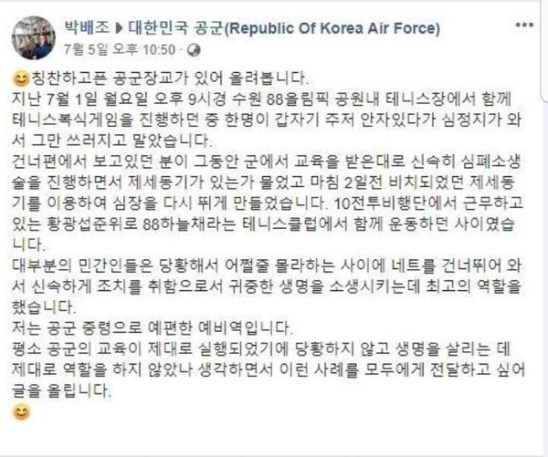 [화제의 인물=김현섭 기자] 지난 1일 테니스 운동 중 의식을 잃고 쓰러진 유 모(48)씨를 골든타임내 심폐소생술 등의 조치로 생명을 구한 군인이 페이스북 등을 통해 뒤늦게 화제가 되고 있다.
