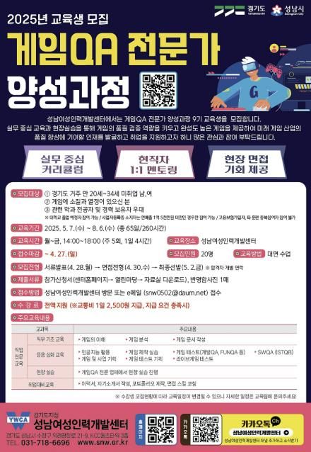 교육은 5월 7일부터 8월 6일까지, 성남여성인력개발센터에서 총 260시간(1일 4시간) 동안 진행되며, 교육비는 전액 무료다. 대상자로 선정되면 게임 품질관리자(QA) 전문가로 성장할 수 있는 실무 중심의 전문 교육을 받게 된다.