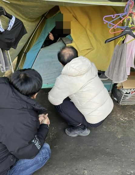 성남시노숙인종합지원센터 종사자들이 모란역 인근에 텐트를 치고 생활 중인 노숙인을 지원하려고 대화 시도 중이다