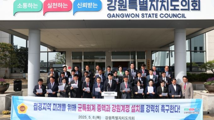 (정도일보) 강원특별자치도의회는 8일 의회 본관 앞에서 “접경지역 추가 지정에 따른 지역균형발전특별회계 예산 지원 확대 건의문”을 접경지역 개발촉진지원 특별위원회 위원장 박대현 의원(국민의힘, 화천) 대표로 발표했다.