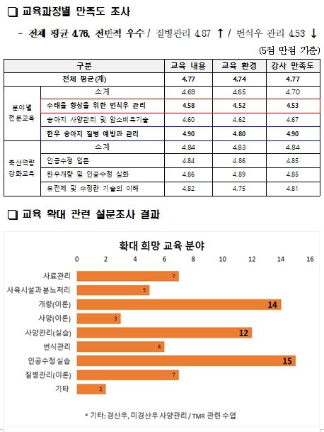 특히 만족도가 높았던 ‘한우 개량 및 인공수정 심화 과정’은 교육 횟수를 확대하고, 암소 모형 교보재를 활용한 실습을 강화해 교육의 실효성을 높일 계획이다.