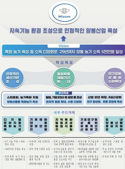 기존 양봉산업은 벌꿀 소분·포장 등 단순 유통에 머물며 식품, 화장품, 신약 등 연관 산업으로의 확장에는 한계가 있었다. 이를 해결하기 위해 종봉·화분매개·로얄젤리·프로폴리스 등 전문·특화 농가를 육성하고 스마트장비 보급과 양봉산물 R·D를 강화해 기능성 제품 기반의 고부가가치 산업으로 체질을 전환한다는 방침이다.