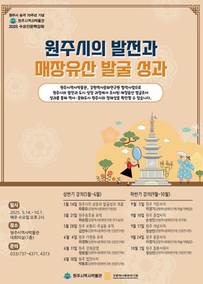 이번 강좌는 원주시 승격 70주년을 기념하여, ‘도시 성장에 따른 매장유산 발굴성과’를 주제로 총 11회에 걸쳐 상·하반기로 나누어 진행되며, 원주시민을 포함해 관심 있는 누구나 참여할 수 있다.