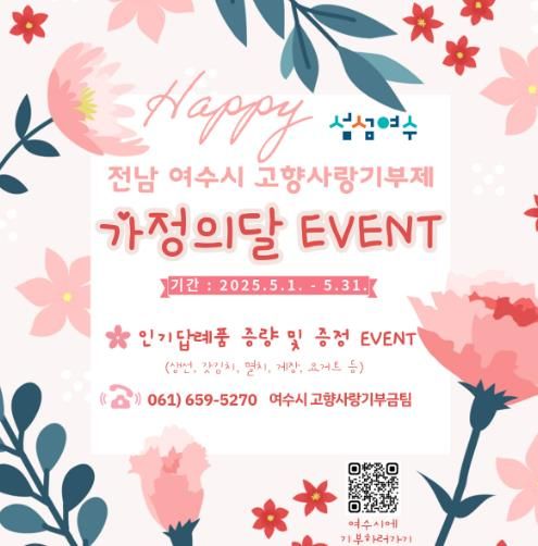 (정도일보) 여수시는 가정의 달 5월을 맞아 고향사랑기부제에 참여한 기부자에게 감사함을 전하고자 일부 인기 답례품을 추가 증정하는 이벤트를 오는 31일까지 진행한다고 14일 밝혔다.