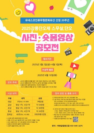 2025강릉단오제 '사진·숏폼영상 공모전' 주제는 2025 강릉단오제를 담은 1분 이내의 영상이나 사진 콘텐츠로 강릉단오제의 숨겨진 즐거움을 드러내는 작품, 축제를 즐기는 다양한 모습을 담은 사진이나 1분미만의 짧은 영상이면 누구나 참여가 가능하다. 개인당 제출 가능한 출품작의 수는 최대 영상 3개, 사진 10장 이내로 제한된다.