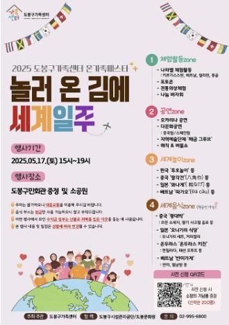 도봉구가족센터의 주관으로 열리는 이번 행사는 다양한 민족 문화권 사람들이 한 데 어울려 즐길 수 있는 다채로운 공연과 체험활동으로 꾸며진다.