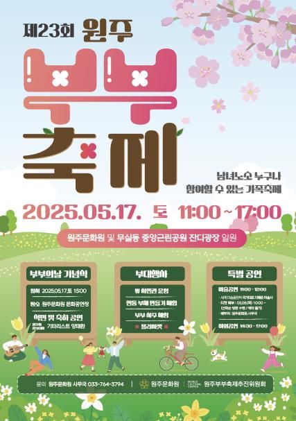 (정도일보) 원주부부축제 추진위원회는 5월 가정의 달 및 부부의 날(5월 21일)을 기념해, 오는 17일(토) 원주문화원에서 ‘제23회 원주부부축제’를 개최한다.