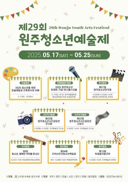 예술제는 어울림마당, 박경리문학공원, 치악예술관 등 원주 대표 문화공간에서 진행되며, 문학·연예예술·국악·음악·미술·연극·사진 등 7개 분야 프로그램을 통해 청소년들에게 다양하고 풍성한 예술 세계를 보여줄 예정이다.