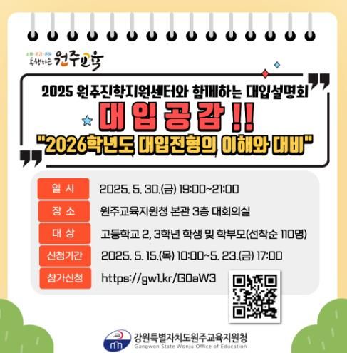(정도일보) 원주교육지원청은 5월 30일 19시 원주교육지원청 3층 대회의실에서 ‘2025 원주진학지원센터와 함께하는 대입 설명회 '대입공감!!'’을 개최한다.